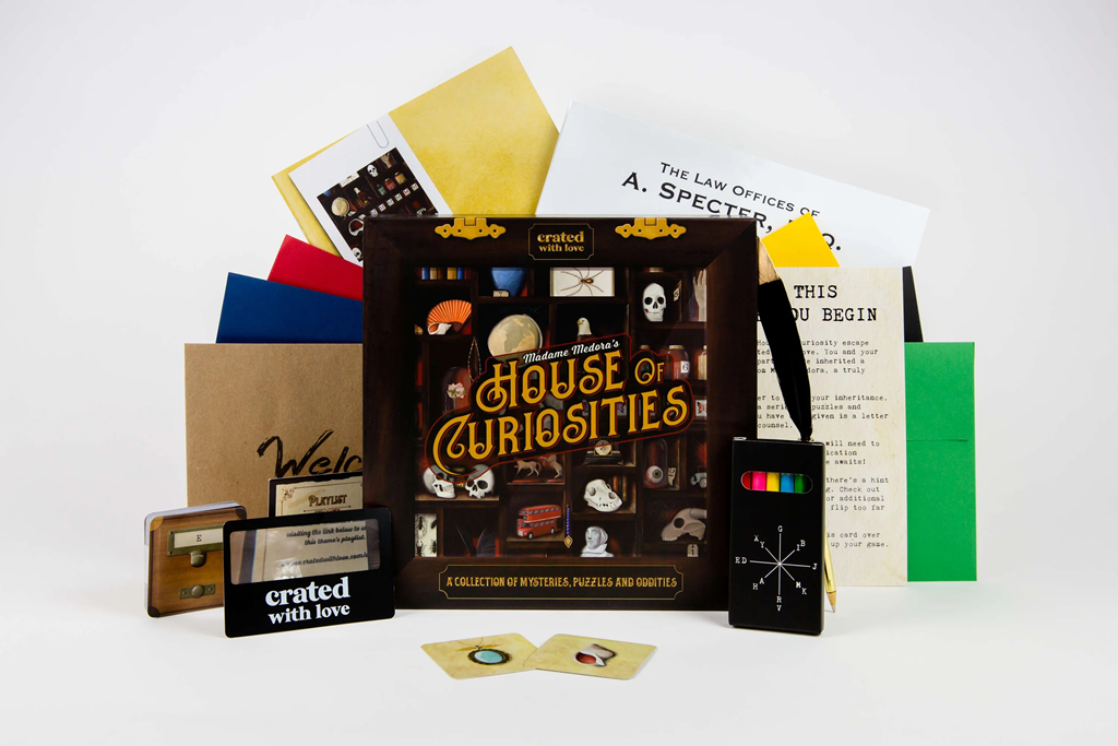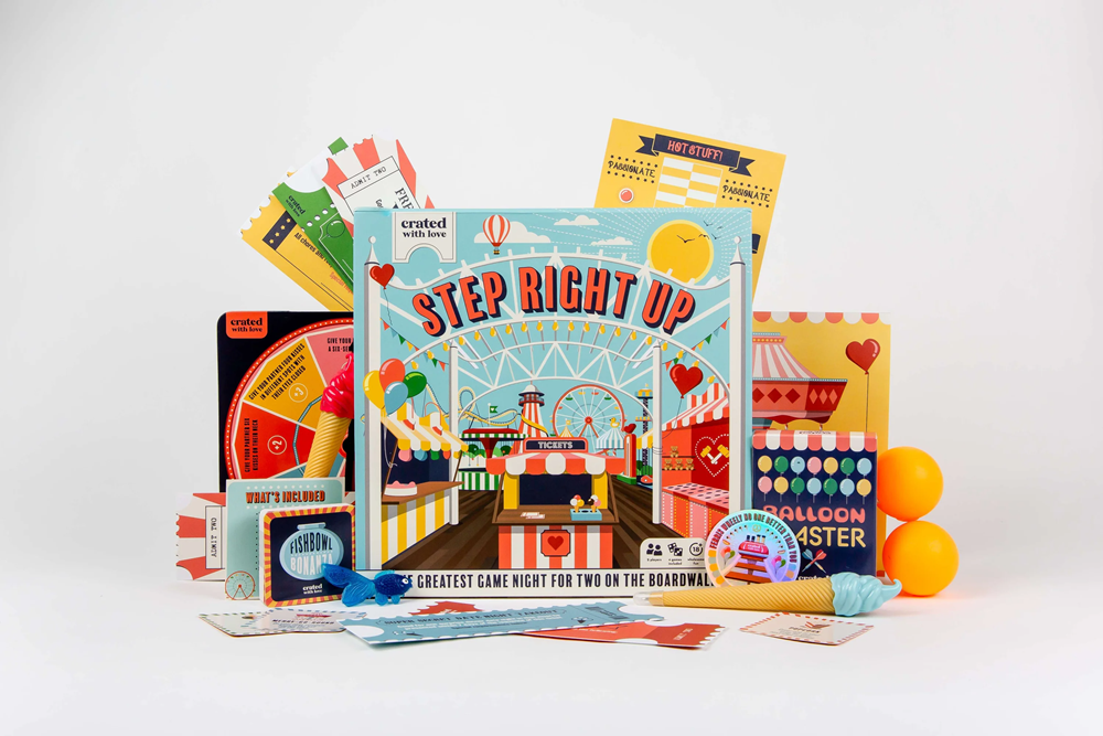 Stuck on date ideas? Snag this bundle of two Crated With Love date night boxes. Each box comes stocked with everything you need for an epic couple's night: an immersive themed game and unique date content, such as recipes or playlists. Get excited for some fun quality times ahead What's included: 1. Step Right Up - The Greatest Game Night for Two on the Boardwalk Perfect for couples that like to play games and be playful with each other. Welcome to a scintillating, abso-lutely stupendous game night at the boardwalk, where the popcorn's piping, the rides are rickety and the prizes are plentiful! From the Ferris wheel views to the deep-fried delights, tonight's date night is a perfect carnival game night getaway. So get your tickets, step right up and get ready for the greatest game night for two on Earth! 2. Madame Medora's House of Curiosities (Escape Room Box) Perfect for couples who love puzzles, mysteries, and escape rooms! A collection of mysteries, puzzles, and odditites! You've inherited a large estate from Madame Medora, a truly odd character. However, in order to claim your inheritance, you must solve a series of puzzles and riddles while spending one night in her House of Curiosities. If you do, treasure awaits!